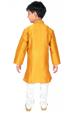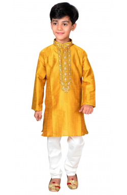 Desi Sarees Southall London UK offers brand new with company tag Boys Indian kurta (top) in Gold Art Silk fabric available in various sizes with Light Gold and Gold Resham ( thread) embroidery with Gold piping in front along with cream polyester cotton Churidar (pants).