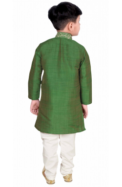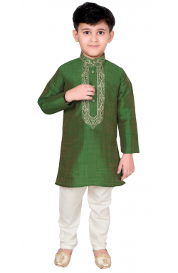Boys kurta pajama set from Desi Sarees Southall London in Silk blend fabric embroidered with zari, resham (thread) and has gold buttons in front, comes along with cream/off white polyester cotton pajama (pants). This traditional Churidaar pyjama (pants) has a drawstring around the waist is made slightly longer so it scrunches up at the ankle as shown in the image.