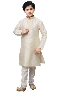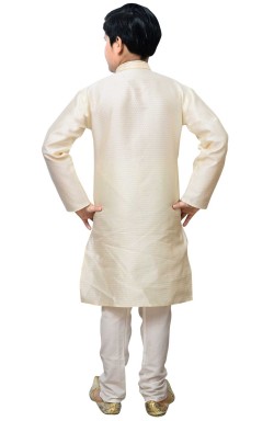 Boys kurta pajama set from Desi Sarees Southall London in Jacquard Kurta top with blended cotton off white/cream pajama pants. This traditional Churidaar pyjama (pants) has a drawstring around the waist is made slightly longer in length so it scrunches up at the ankle as shown in the image.