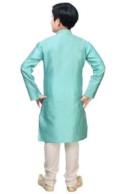 Desi Sarees Southall London UK offers brand new with company tag smart Boys kurta (top) in Turquoise Art Silk fabric in various sizes with Resham and Zari ( thread) embroidery in front along with cream polyester cotton Churidar (pants)