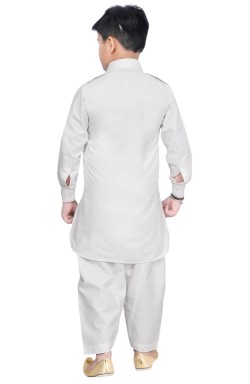 Boys kurta in Jacqard self print fabric with thread embroidery around the neck, comes along with matching trouser in the same material from Desi Sarees Southall London. This has a traditional drawstring pajama Pants trousers.