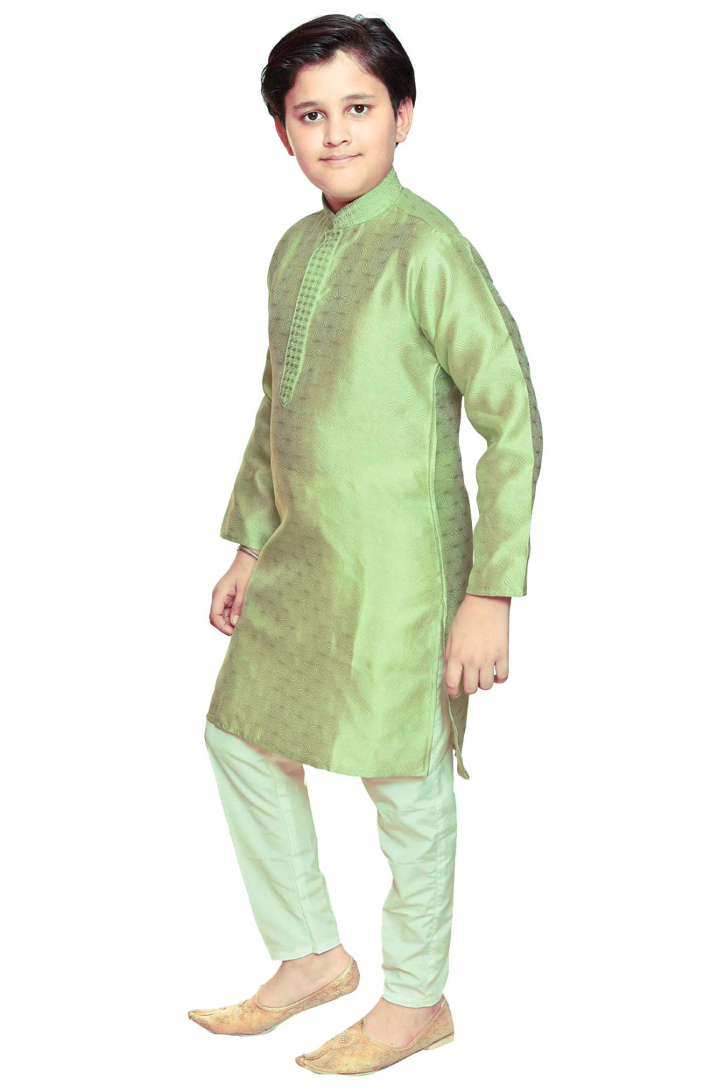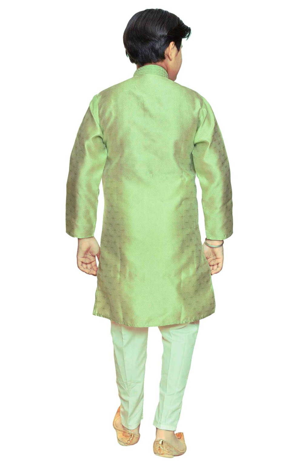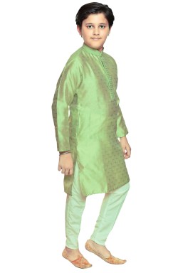 Boys kurta in Jacqard fabric with thread embroidery around the neck, comes along with matching trouser in the same material from Desi Sarees Southall London. This has a traditional drawstring pajama Pants trousers.