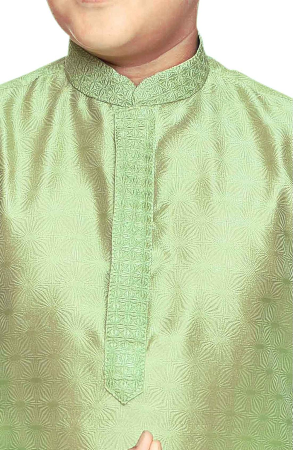 Boys kurta in Jacqard self print fabric with thread embroidery around the neck, comes along with matching trouser in the same material from Desi Sarees Southall London. This has a traditional drawstring pajama Pants trousers.