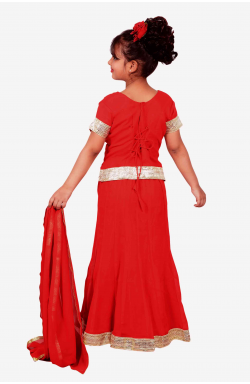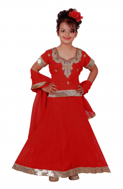 Children lehanga suit in georgette fabric with stones, beads and zari embroidery along with matching dupatta (scarf). Skirt (lehenga) has approx. 2" gold border all around at the bottom as shown in picture.