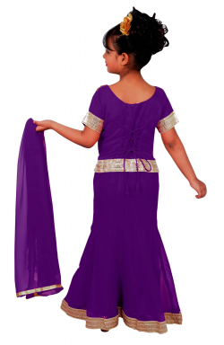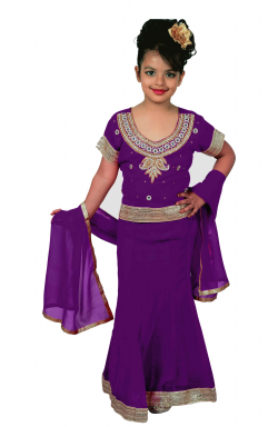 Children lehanga suit in georgette fabric with stones, beads and zari embroidery along with matching dupatta (scarf). Skirt (lehenga) has approx. 2" gold border all around at the bottom as shown in picture.