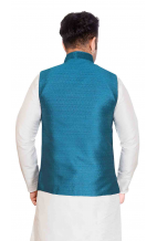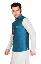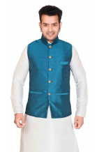 Men's traditional Indian fancy partywear waistcoat in plain silk blend fabric with viscose lining complemented with fancy buttons and front pockets. Available in various sizes. This costume is ideal for weddings, birthdays Eid, Mehendi, Diwali, pre-wedding, Bollywood theme, and fancy dress party.