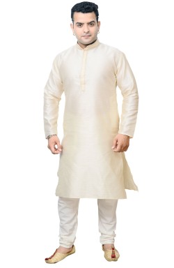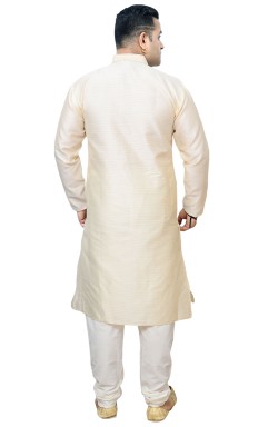 Men's traditional Indian Bollywood style smart band collar Kurta pajama in Jacquard fabric embroidered with Zari and Resham thread, comes with contrast off white Churidaar Pajama. The pyjama comes with drawstring around the waist.