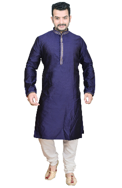 Men's traditional Indian Bollywood style smart band collar Kurta pajama in Jacquard fabric embroidered with Zari and Resham thread, comes with contrast off white Churidaar Pajama. The pyjama comes with drawstring around the waist.