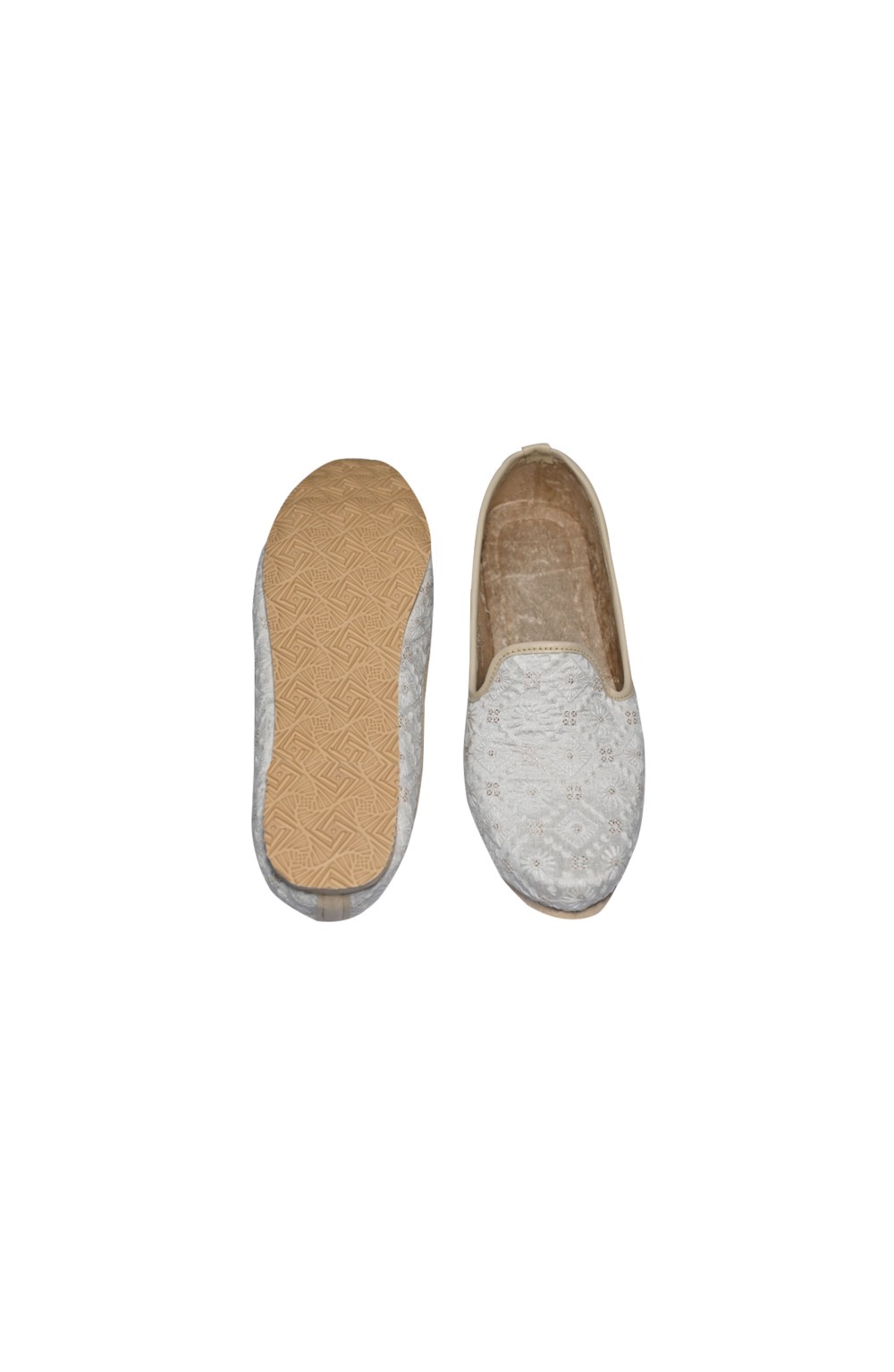 This Punjabi Jutti also called Mojari originating from Punjab India and Pakistan which is made from synthetic fabric Some with zari or thread work and velvet lining cushion for comfortable wear. These shoes are known for their intricate designs and craftsmanship.