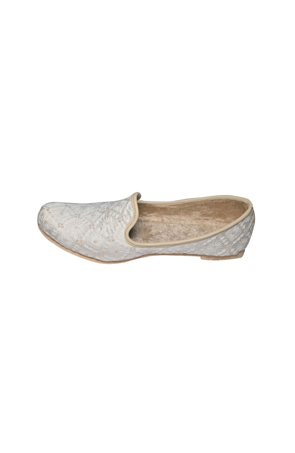 This Punjabi Jutti also called Mojari originating from Punjab India and Pakistan which is made from synthetic fabric with zari work and velvet lining for comfortable wear. These shoes are known for their intricate designs, craftsmanship, and cultural significance.