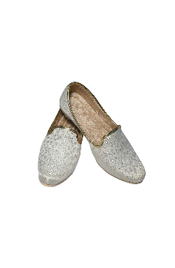 This Punjabi Jutti also called Mojari originating from Punjab India and Pakistan which is made from synthetic fabric Some with zari work and velvet lining cushion for comfortable wear. These shoes are known for their intricate designs and craftsmanship.