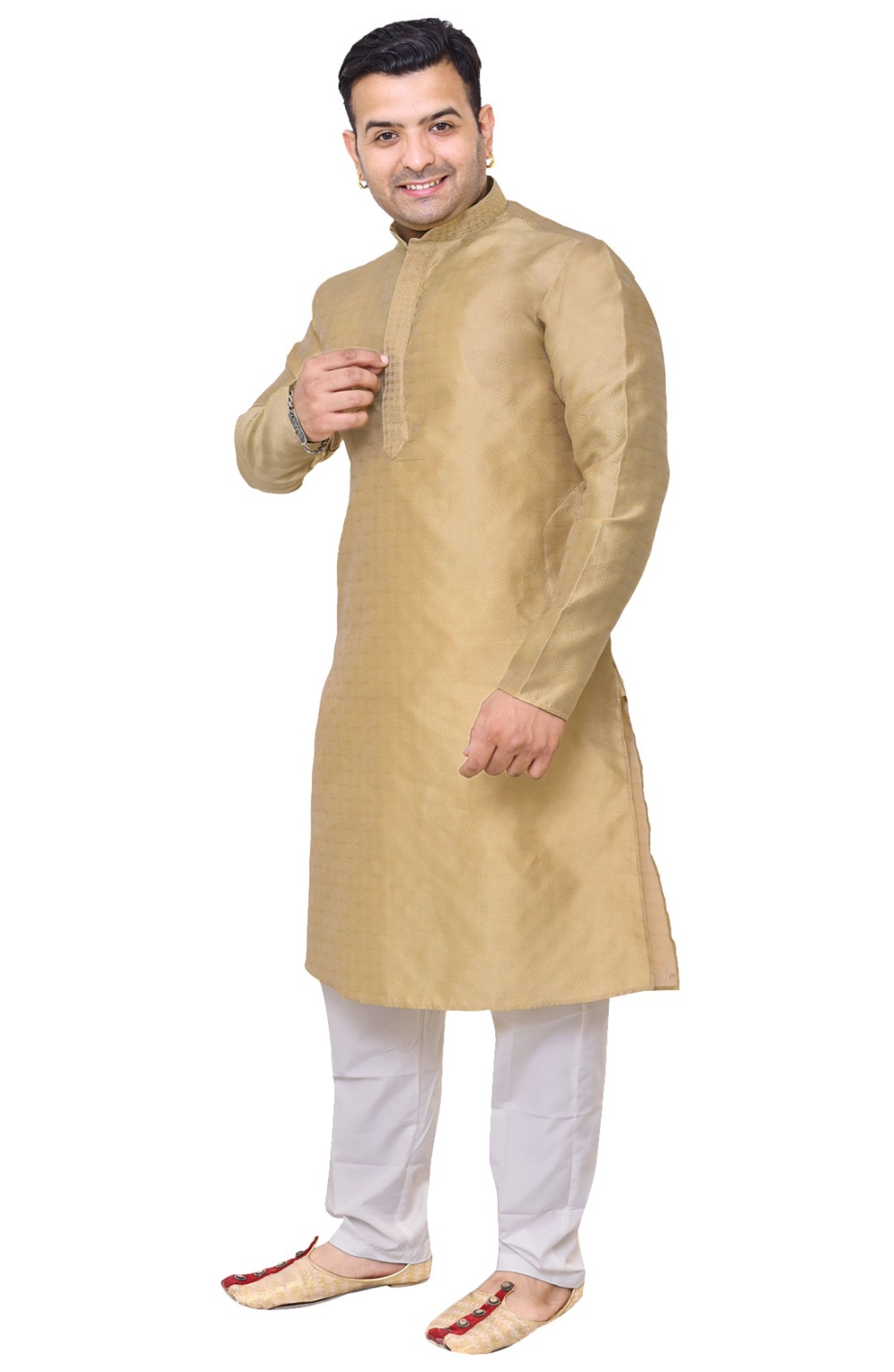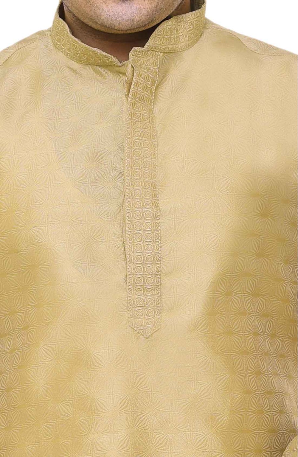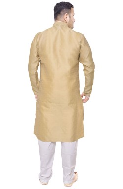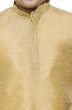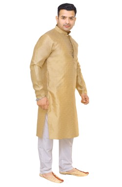 Men's Kurts in Jacquard with same colour thread embroidery around the neck, comes with off white contrast trouser style bottoms with drawstring around the waist.