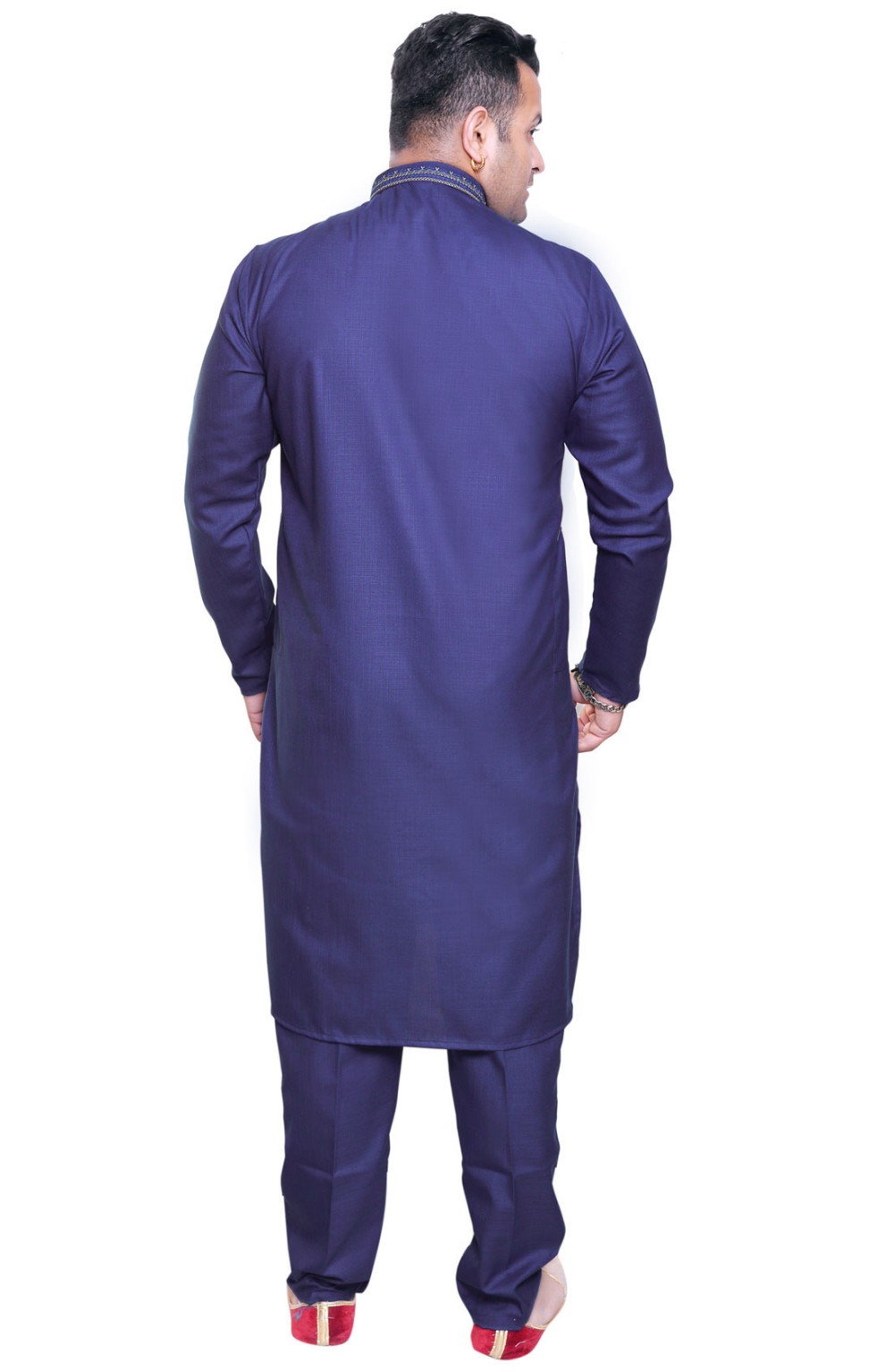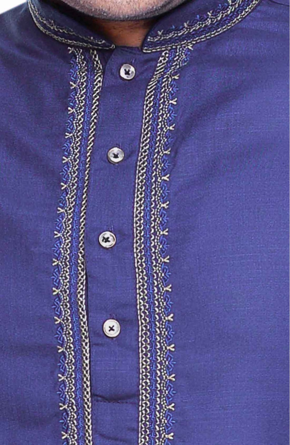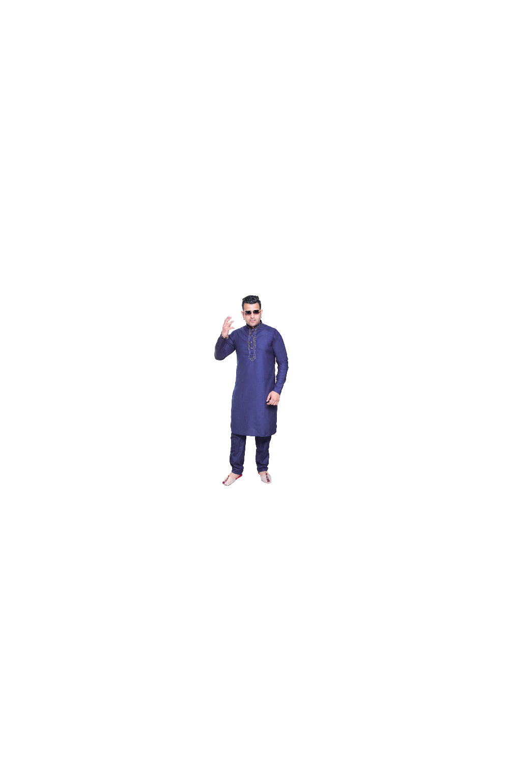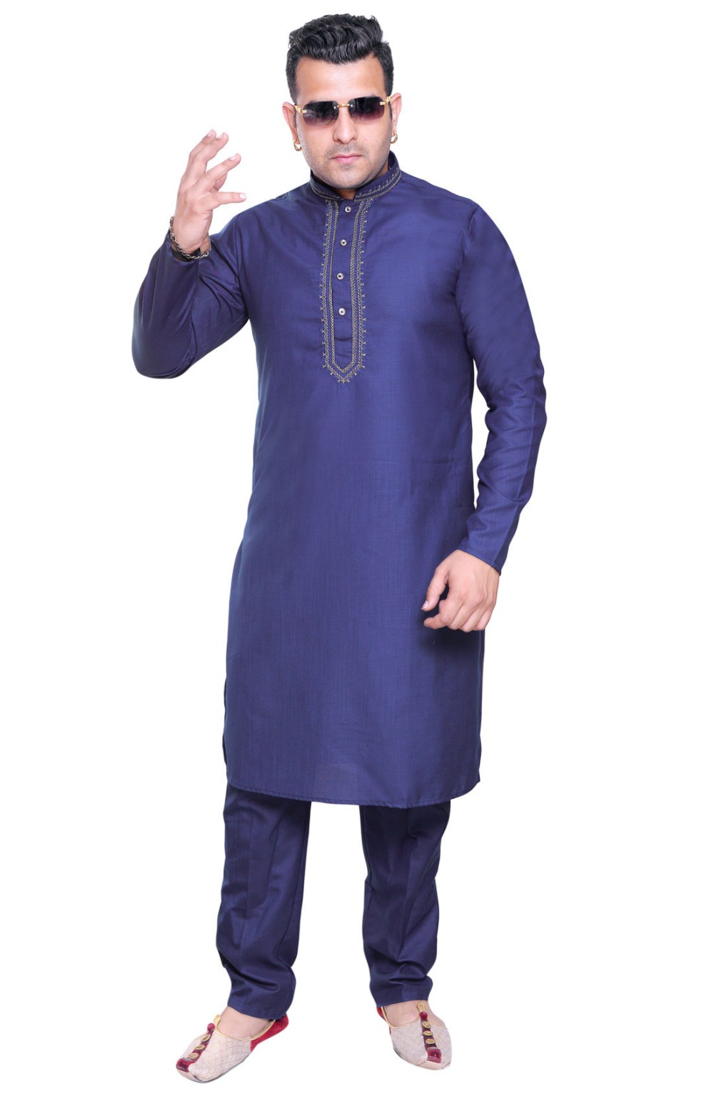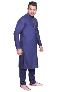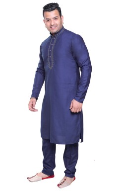 Men's traditional Indian Bollywood style smart band collar Cotton Kurta with neck embroidery comes with matching trouser style pajama. The pyjama comes with drawstring around the waist and two pockets either side.