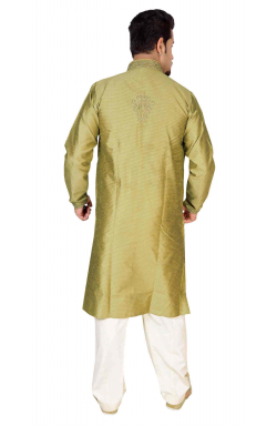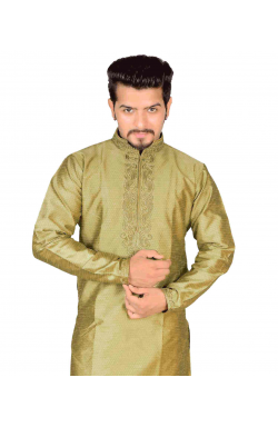 Exclusive men kurta (top) in Art Silk fabric from Desi Sarees Southall available in various sizes with zari and resham (thread) embroidery in front and along with cream polyester cotton salwar (pants). This traditional Salwar (pants) is meant to be baggy with drawstring around the waist.