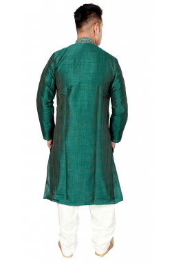 Exclusive Mens kurta (top) from Desi Sarees Southall London in Art Silk fabric embroidered with zari and resham (thread) and fancy buttons in front, comes along with cream polyester cotton salwar (pants). This traditional Salwar (pants) is meant to be baggy with drawstring around the waist.