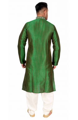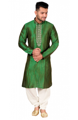 Exclusive men blended silk kurta (top) from Desi Sarees Southall London embroidered with zari and resham (thread) comes with cream polyester cotton salwar (pants). This traditional Salwar (pants) is meant to be baggy with drawstring around the waist.