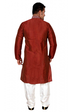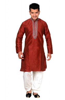 Desi Sarees Southall London UK offers brand new with company tag exclusive men Maroon colour kurta (top) in Art Silk fabric available in various sizes with zari and resham (thread) embroidery in front and along with cream polyester cotton salwar (pants).