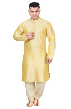 Men's traditional Indian Bollywood style smart band collar Kurta pajama in plain Dupion fabric comes with contrast off white Churidaar Pajama. The pyjama comes with drawstring around the waist.