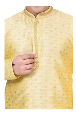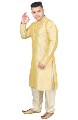 Smart Asian Men's ceremonial Kurta for weddings and party, kurta (top) fabric in blended silk has a self-print floral pattern all over. Mandarin collar is embroidered with stones, beads, zari and has stone buttons front, This kurta comes with matching plain antique gold blended silk traditional Salwar (pants) which is baggy with a drawstring around the waist.