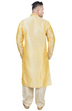 Exclusive design from Desi Sarees Southall London, men's Light Gold cotton silk kurta (top) in mandarin collar embroidered with resham (thread) and zari with Polyester cotton cream (Off white) Shalwar (pants). This traditional Salwar (pants) is meant to be baggy with drawstring around the waist.