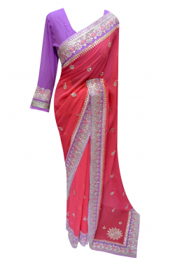 Women's Clothing from desi sarees uk offers Indian saree in Crimson and Lilac colour contrast Chiffon fabric with 3 inches border has floral pattern embroidery all over with sequins, Zari and resham (thread) as shown in picture, comes with ready made blouse. Colours may vary slightly.