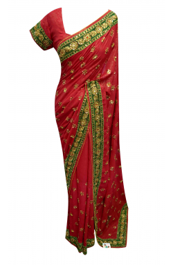 Self printed Chiffon 3 inches wide border saree in Red colours with zari, resham (thread) and tiny stones embroidery on the border as seen in picture with long sleeves. Perfect for weddings, birthdays and parties.