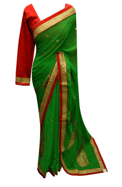 Women's Clothing from desi sarees uk offers Indian Green saree in Chiffon fabric with 2 and half inches contrast border with gold zari, sequence and stones embrodery as shown in picture, comes with ready made contrast blouse in size 38" (10-12 UK) with enough margin inside which can be altered up to size 42" (14-16 UK). Blouse length is approx. 15"-16" Colours may vary slightly.