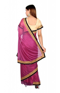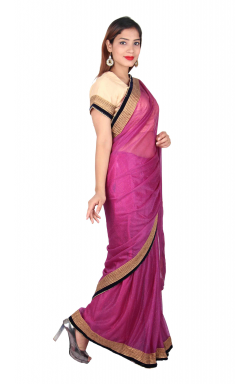 Pink Chiffon 3 inches wide colour contrast border saree with Zari (Gold thread) embroidery. Comes with ready made matching saree blouse as shown in picture. Ideal for weddings, birthdays and parties.
