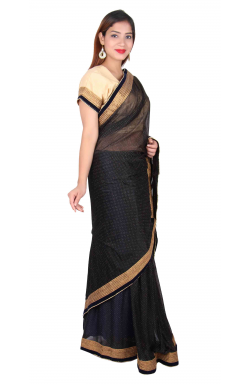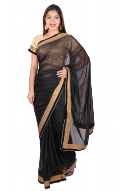 Women's Clothing from Desi Sarees Southall London UK offers Black colour Indian saree in shimmer synthetic fabric with approx. 3 inches wide antique Gold lace and velvet border as shown in picture, comes with ready made Gold raw silk blouse in size 38" (10-12 UK) with enough margin inside can be altered up to size 42" (14-16 UK).