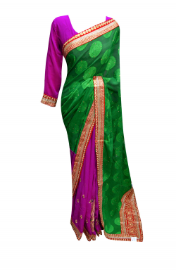 Chiffon 2 inch wide border saree in contrast colours stripes with zari, resham (thread) beads and tiny stones embroidery. The end of the saree (pallu) finishes with brocade fabric to give that special rich designer look. Back of Ready made Blouse is embroidered available in long sleeve as shown in picture.