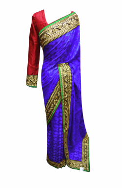 Desi sarees in London offers Indian multicoloured saree in Blue, Turquoise, gold and Black contrast colour in Art Crepe fabric with 3 and half inches border embroidered with zari, sequins and beads. Second half of the saree is in gold net with glitter work as shown in picture, comes with ready made blouse in size 38" (10-12 UK) with enough margin inside can be altered up to size 42" (14-16 UK).