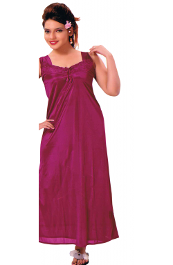 Ladies long nightie with gown in satin lycra fabric available in various colours with net lace on front as shown in picture. This night dress is suitable for casual indoor wear. Colour may vary slightly.