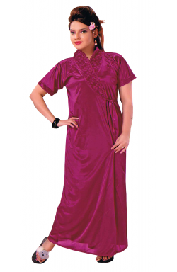 Long nightie with gown in satin lycra fabric available in various colours with net lace on front as shown in picture. This night dress is suitable for casual indoor wear. Colour may vary slightly.